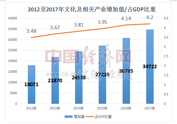 然而数据显示,2017年全国文化及相关产业增加值为34722亿元,占GDP的比重为4.2%,比上年提高0.06个百分点。这与国民经济支柱产业的理论值,即占GDP的比重达到5%来说,还有一定的距离。