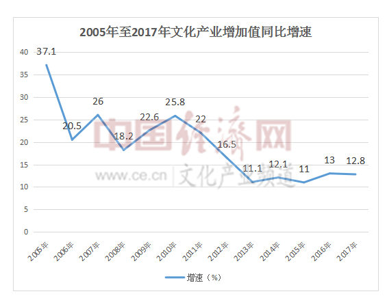 经济日报-中国经济网北京10月12日讯 (记者刘园香 魏金金)10日,国家统计局发布了2017年我国文化及相关产业权威数据。经济日报-中国经济网记者发现,与之前几年相比,2017年我国文化及相关产业增加值的增速虽然仍保持在12%左右的水平,但占GDP的比重仅比前一年提高了0.06个百分点,这距离2020年文化产业成为我国国民经济支柱产业的理论值,即占GDP的比重达到5%来说,还有一定的距离。